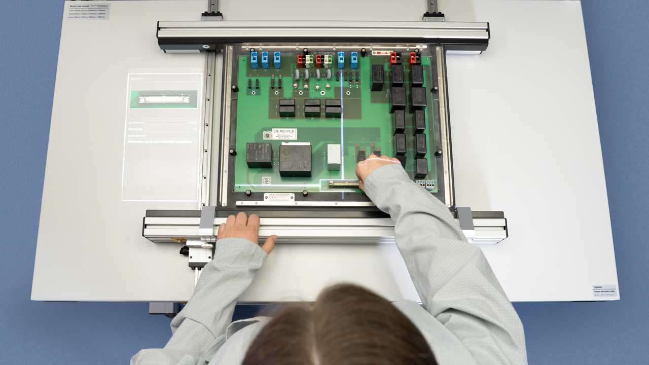 The Multi Line Assist can be used both at manual THT assembly stations and in automated production lines. The system projects assembly instructions directly into the operator’s field of vision, significantly reducing assembly times. The integrated AOI module checks the component placement after each step or at the end of the assembly process and reliably detects errors such as incorrect polarity, missing components, or color and labeling deviations. All results are documented, can be statistically evaluated, and forwarded to MES systems.